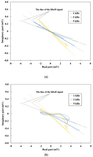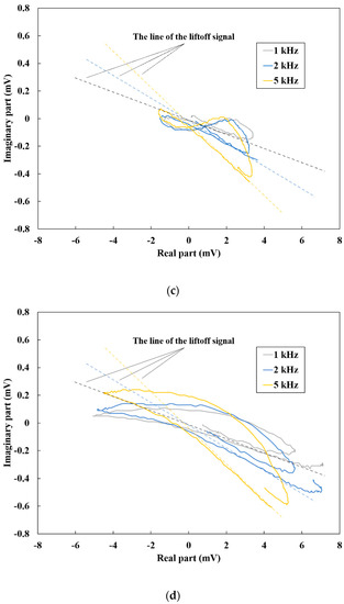 In this subsection we investigated a signal extraction method to emphasize the crack-induced signal change that is not influenced by the liftoff variations caused by the probe tilt. We observed that the differential parameters of the two sensors can reduce the magnetic noise and influence of the liftoff. In addition, even when the differential parameters are affected by the liftoff, the Lissajous curves of the crack and non-crack signal are assumed to show differences. Figure 10 shows the Lissajous curves of the differential vector with different liftoff between 0.1 and 0.9 mm. The sensor probe was line-scanned vertically and not vertically at a frequency of 1 kHz. The Lissajous curves of non-crack area which correspond to the baselines shown in Figure 7a,b and Figure 8a,b are also described. When the sensor probe was vertical to the flat steel plate, the signals of the non-crack area were almost at the origin (Figure 10a). This result indicates that the influence of the liftoff variation could be reduced by the differential parameters. Thus, the crack signal was easily extracted by the Lissajous curve (Figure 10b). On the other hand, when the sensor probe was not vertical, the signal of the non-crack area shifted mainly in the X-direction as shown by the dotted arrow (Figure 10c). However, the crack signal was observed in a different direction (Figure 10d). This result suggests that the crack signal can be discriminated using the Lissajous curve even when the signal fluctuates due to the liftoff variations of the tilted probe. However, the difference between the crack signal and the signal change caused by the liftoff is assumed to depend on the frequency of the applied magnetic field. Thus, in the next subsection, the frequency dependence of each signal is discussed.