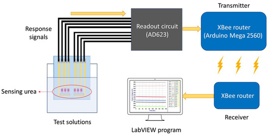 The schematic of the wireless measurement system, which includes a urea biosensor, a readout circuit, an XBee module, and a computer with the LabVIEW program.