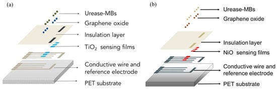 The structure schematics of (a) the MBs-urease/GO/TiO2-based biosensor [25] and (b) the MBs-urease/GO/NiO-based biosensor [26].