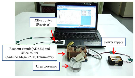 The device platform used here is shown in Figure 3 and combines an XBee module (Digi International, Hopkins, MN, USA) readout circuit (AD623), the Arduino Mega 2560, a microcontroller board based on the ATmega 2560 from Atmel Corporation (San Jose, CA, USA), and a power supply. The wireless measurement system is based on ZigBee standard to transmit the response signals from the biosensor. The input voltage to the device could be switched between 3.3 V and 5 V by the Arduino Mega 2560, which provided enough power that the XBee router and readout circuit could function correctly. The Arduino Mega 2560 was used for conversion of the analog signal to a digital signal. The XBee router (which includes the Arduino Mega 2560) was used for receiving the signals from the sensor and transmitting them to the XBee coordinator. Lastly, the signals were converted in the computer for use with the LabVIEW software suite [29].