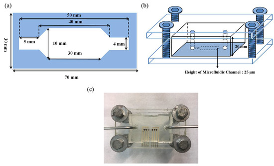 The microfluidic measurement system consists of a microchannel, a pump, an injector, a waste container, and a potentiometric measurement system. The test solution was injected into the device and flowed into the microchannel through the pump, which pushed it through the sensing area and controlled the flow rate. The 2D, 3D schematics, and the close-up image of the microfluidic device were shown in Figure 4. The height of the microfluidic channel is 25 µm, as shown in Figure 4b. The detailed information about the microfluidic measurement system can be found in our previous study [30]. In this work, the average sensitivities at different flow rates of 20 ml/h, 30 ml/h, 40 ml/h, and 50 ml/h were investigated.