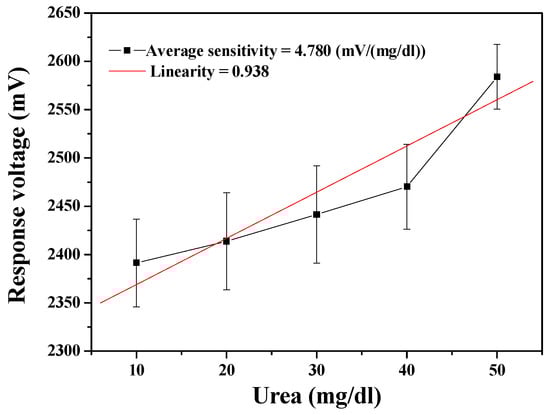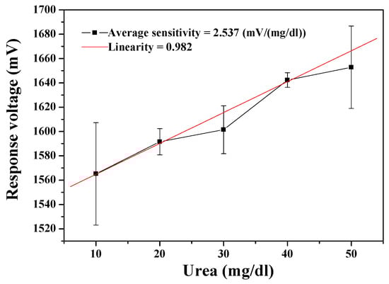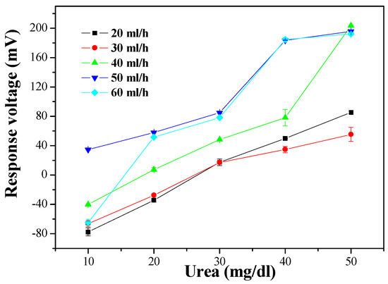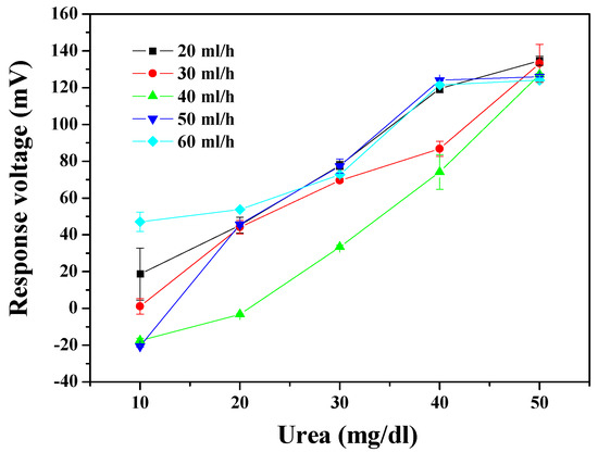 The dynamic measurement aspect of the urea biosensor was integrated with the microfluidic measurement system. The dynamic measured results are presented in Figure 7. The optimal sensing characteristics, of average sensitivity and linearity, were 4.256 mV/(mg/dl) and 0.995 at a flow rate of 40 ml/h. Average sensitivity and linearity of the urea biosensor are shown in Table 2; it specifies the sensing properties with different flow rates of 20 ml/h, 30 ml/h, 40 ml/h, 50 ml/h, and 60 ml/h. The result shows that the trend of sensitivity was unchanging as the flow rates gradually increased. When the flow rate was higher than 40 ml/h, the sensing property began to decay. This phenomenon may be attributed to the rapid flow rate causing the solution passing through the sensing area too quickly to achieve an equilibrium potential for the response voltage [20,31]. From a hydrodynamic point of view, fluids at a high flow rate are subject to flow-induced vibration (FIV) in the microfluidic level. Owing to the fluidic shock, vortex-induced vibrations (VIV) possibly are triggered by FIV [32]. From inferred reasons, it can be explained that the sensitivity was decreased at a high flow rate. Regardless of the reasons, the properties performed here, by the urea biosensor, reach the standard required for use under the dynamic conditions. This means that urea could be adequately detected under dynamic conditions by the proposed system.