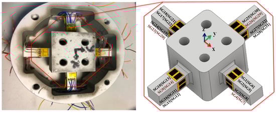 In this study, a novel positioning of strain gauges was proposed in which 16 double parallel-type strain gauges were placed on a sensor structure. The strain gauge from HBM (DY43-3/350) with a resistance of 350 Ω was used as a transducer. Figure 2 illustrates the arrangement of 16 double parallel strain gauges. Each set of four strain gauges was arranged into six Wheatstone full-bridge circuits. The placement process involved the attachment of strain gauges at the maximum deformation locations for maximizing sensitivity along the applied force and moment axes. Therefore, the strain gauges were arranged with different force and moment components during measurement. For example, Equation (1) illustrates the application of the bending beam with a force in the x-axis of a bridge mounted in tension (SG28 and SG15) and other mounted in compression (SG31 and SG12). Moreover, the x-axis of a bridge of the bending beam was loaded with a moment mounted in tension (SG25 and SG13) and the other mounted in compression (SG30 and SG10). In this full-bridge configuration, Figure 2 presents strain gauge bonding, the output signal of six components of the forces and moments can be measured using strain gauges attached to the beams.