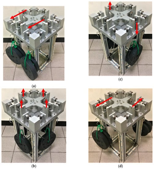 In the calibration setup, F/M sensors are the source of the reference force or reference moment. In general, calibration is performed using a standard weight or a set of standard weights to produce a reference force under gravitational pull. The reference moment can be established using a known distance lever and reference force on the calibration jig. Determining the actual value of the gravitational constant at the location of the calibration device may be necessary for special applications. In this study, four standard weights were applied in the positive and negative directions under unloaded conditions. The calibration test was performed by applying pure forces and moments without any eccentricity (Figure 5). Figure 5a displays the calibration setup for the loading test of pure axial forces Fx and Fy. The developed sensor was mounted at the center of the calibration jig and then tightened from the top side of the cross lever of the jig. Figure 5b displays the calibration setup for the loading test of the pure axial force Fz. Figure 5c,d presents the calibration setups for the loading test of the pure moments Mx, My, and Mz. The signal voltage output of the SG was calculated using Equations (1) and (3).