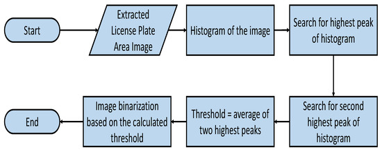 Once the LP region is extracted, character segmentation is employed to extract the LP characters. For this purpose, as a first step, the LP region is binarized using the algorithm shown in Figure 5. First, we calculate the intensity histogram of the LP region image and then find the two highest peaks in this histogram. We considered the two highest peak because the LP mostly consists of two colors, that is, the LP background color and the characters’ color. The threshold is the average value of these two peaks.An LP grayscale image is then binarized using this threshold. We extract characters from the binary image using 8-connectivity, considering a character height of 30 to 90, a width of 10 to 40 and an area of 700 to 800 pixels.