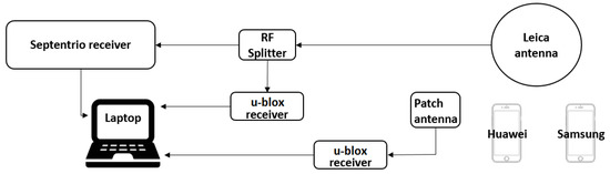 The test schematic. The signal from the Leica antenna was transmitted through the RF splitter to both the u-blox and Septentrio receivers.
