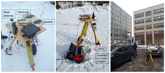 The same test equipment setup was applied in all three field experiments conducted near Helsinki, Finland; see Figure 2. The open sky experimentation campaign providing the data that we analyzed in this paper was performed in Kirkkonummi (N 604° 9′ 3.7902″, E 24° 32′ 6.7806″). Data were logged for one hour, as was the case for the other two campaigns, as well. The additional open sky experimentation campaign was performed in Metsähovi (N 60° 13′ 02.8400″, E 24° 23′ 40.200″) a few meters away from the permanent FinnRef reference station (FIN18). The semi-urban experiment took place in the city center of Espoo (N 60° 12′ 21.2642″, E 24° 39′ 15.4588″), where some buildings surrounded the test site; see Figure 2. Because of the buildings, some signal multipathing errors were expected at this site.