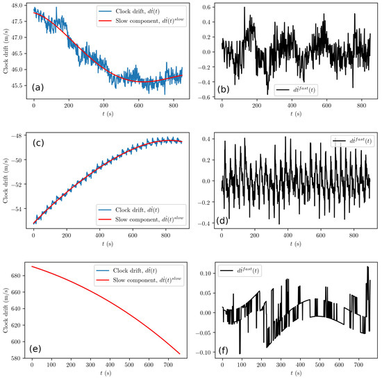 Open sky results for the (low-grade) Samsung S8 smartphone receiver (a,b), the (medium-grade) u-blox receiver connected to the patch antenna (c,d) and from the (high-grade) Septentrio receiver connected to the Leica antenna (e,f). In (e), clock drift and slow component lines overlap because the fast component shown in (f) is very small. Note that the saw-edge lines in (f) are due to the self-correcting behavior of the (high-grade) Septentrio clock.