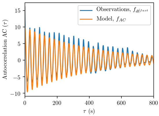The fast component, which we were interested in, showed small 0.1–0.4-m/s noise in Figure 3b. These data, when without temporal correlations, can be modeled with a normal distribution, such as the rightmost term in Equation (7). The temporal oscillations of the fast component, however, required further analysis. Here, we performed an exemplary analysis of the u-blox data shown in Figure 3b, by calculating an autocorrelation function using Equation (24); see Figure 4. The autocorrelation function obtained from the fast clock drift followed the form of the following model function: