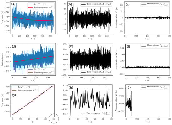 Code measurement noise analysis (Delay Lock Loop (DLL)) from GPS L1C pseudorange data for Samsung S8 (a–c), u-blox with the patch antenna (d–f), and Septentrio (g–i) receivers. (a,d,g) Raw data with a red line showing the slow component trend. (b,e,h) The fast component is within m. (c,f,i) Autocorrelation function calculated from the fast component. For visualization purposes, we have selected less data for (g); see the impact on (h) and (i).