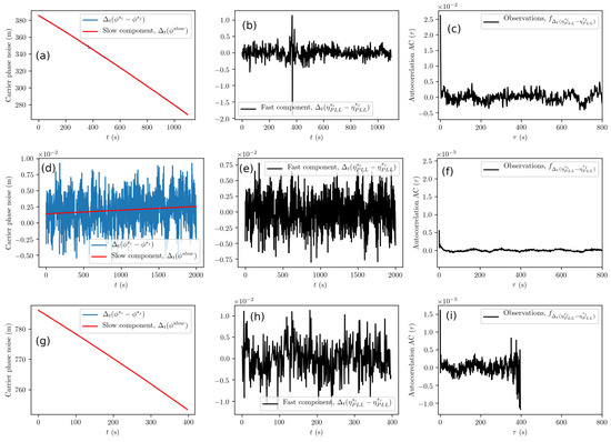 Carrier phase noise analysis (Phase Lock Loop (PLL)) from GPS L1C data for Samsung S8 (a–c), u-blox with the patch antenna (d–f), and Septentrio (g–i) receivers. (a,d,g) Raw data with a red line showing the slow component trend. (b,e,h) PLL fast component. In (e), variation is within mm. (c,f,i) Autocorrelation function calculated from the respective fast component. Note the anomaly in (b), most likely due to a loop slip. Furthermore, we selected a short times series in (g); see the impact on (i).
