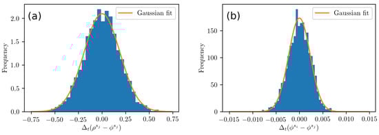 where , as will be shown in the Results Section, and Equation (23) defines as a model parameter. Note again that actually, the variance of the sum of independent random variables is equal to the sum of these variances, so there is no need to assume normal distributions for the purpose of extracting the variance in Equation (22). However, we used a normal distribution to model the PLL error in Equation (23) and verify the validity of this choice in the Results Section.