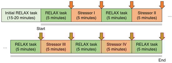 During the initial relaxation stage, each subject was asked to wear a wearable device that collected ECG and RESP data and to completely relax, eliminating any excitement or nervousness regarding the experiment. In addition, we explained our protocol in detail to prevent any mistakes by the subject. During the main experimental stage, the subjects alternately experienced simulated relaxing states (called RELAX tasks in Figure 1) and stressful states. During the relaxation tasks, the subject was asked to sit on a chair in a comfortable position without any mental activity. The first relaxation task aims to build a psychological baseline and remove unwanted excitement before the regular experiment stage. Similarly, the other relaxation tasks aim to remove stress after a stressful task and prepare the next task by setting the psychological baseline. This design improves the reliability of the experiment’s results []. During the stressful tasks, the subject was provided with one of two types of stressors: (1) a math task, namely a quiz requiring the subject to solve a series of subtraction problems via mental arithmetic, or (2) a Stroop task, namely a quiz where the subject was asked to respond with the color of a given word and ignore its meaning. Because all the subjects were Korean, the words were presented in the Korean language. These are typical tasks that have been used to induce stress in previous studies [,,].