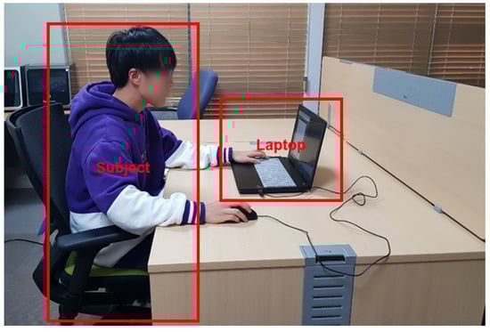 The experiments were conducted on a laptop computer (with a 2.8 GHz Intel Core i7 processor (Santa Clara, CA, USA) and 16 GB of RAM) in a closed room. During each experiment, the subject was alone in the room, as shown in Figure 2. On the laptop computer, a graphical user interface application was installed, which we developed with MATLAB R2016a (MathWorks, Natick, MA, USA). This was designed to be as simple as possible so as not to confuse the subjects.