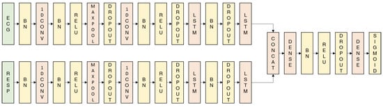 Our proposed network has 50 filters in each of the initial 1D convolutional layers, which has a stride of 1. For the ECG network, there are 50 filters in the second 1D convolutional layer, which has a kernel length of 25 and a stride of 1. For the RESP network, there are 50 filters in the second 1D CNN layer, which has a kernel length of 4 and a stride of 1. Zero-padding was used in all the convolutional layers to maintain the input size. There are 32 and 16 units in the first and second LSTM layers, respectively, and 512 units in the dense layer. The second 1D convolutional layers in the ECG and RESP networks have kernel lengths of 25 and 4, respectively, so as to focus on the same time interval (20 s). All dropout layers have a dropout rate of 0.5 and the weight decay’s regularization strength is .
