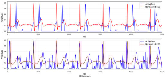 The activations on the first ReLU of electrocardiogram (ECG) signal. To easily see which signal patterns were activated, the activations and the first batch-normalization layer’s output were normalized with MinMax Scaler having a range from 0 to 1. The blue line indicates the activations and the red line indicates the output. Activations around (a) ECG Q and T’s ascending waveform and (b) ECG QRS and T’s descending waveform.