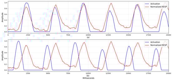 The activations on the first ReLU of respiration (RESP) signal. To easily see which signal patterns were activated, the activations and the first batch-normalization layer’s outputs were normalized with MinMax Scaler having a range from 0 to 1. The blue line indicates the activations and the red line indicates the output. Activations around (a) RESP peak (e.g., inspiration) and (b) RESP nadir (e.g., expiration).