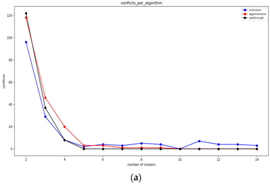 Additionally, the minimum number of conflicts for a given number of storage nodes is estimated in this DCA phase and the results that can be achieved by the selected algorithms are aggregated. The algorithms implemented and empirically matched to this type of networks are the walkthrough [2], constrained hierarchical agglomerative algorithm [39,40], pck-means [39,40], which are described in Appendix A. These algorithms have been selected among other popular algorithms, such as constrained spectral clustering [39,40], cop kmeans [39,40], etc., once initial experimentation indicated that they are more stable regarding the overall number of conflicts imposed. As depicted in Figure 2, constrained spectral clustering is not even comparable with constrained hierarchical agglomerative algorithm and that is why it was excluded from the selection of the algorithms. Cop kmeans constitutes a greedy algorithm that does not allow even one of the constraints to be violated. For this reason, it does not match with our concrete problem. The number of clusters is selected according to the IoT network characteristics, the number of sensor nodes and the respective sensor network density. Once the initial sensor node clustering is performed, each cluster is bound to a specific storage node.