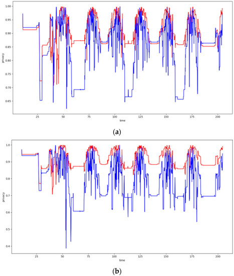 Apparently, since , , the same also stands for , i.e., , . Since a single value for the average privacy metric is calculated for each entire experiment, this metric is a quite reliable evaluation criterion that can be used to compare the performance of the various algorithms for a given experiment.
