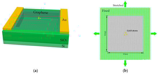 Schematics of the stretched graphene-based mass sensor. (a) A monolayer graphene sheet suspended on a silicon oxide substrate. (b) A peripherally fixed stretched monolayer graphene sheet with gold atoms absorbed on the surface.