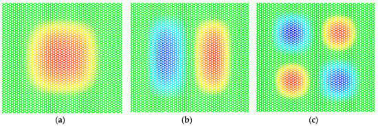 The factor Snm (x, y) represents the effect of the absorbed mass distribution. In order to obtain the value of Snm (x, y) corresponding to each position, we divided the graphene sheet into 100 small square areas, and two gold atoms were placed on each of them in turn. The resulting frequency shift was then calculated by the MD simulation. After the traversing of all 100 areas, the results are illustrated in Figure 4. For this part, the prestress was set to 47 GPa, so the stress caused by oscillation (about 0.2 GPa) can be neglected. The frequencies of mode11, mode21 and mode22 were 323.2 GPa, 515.4 GPa, and 647.4 GPa respectively, which agrees well with the theoretical values of f11 = 326.8 GPa, f21 = 516.8 GPa, and f22 = 462.2 GPa. When two gold atoms were placed on the graphene surface, the corresponding frequency shifts Δfnm were obtained using the MD simulation. As for the right side of Equation (5), the vibrating part of the graphene contained 3854 carbon atoms with a molar mass of 12, and the molar mass of the two absorbed gold atoms was 197, therefore calculating Δm/m0 as 0.0085. In this way, the value of Snm (x, y) can be confirmed by Equation (5), as illustrated in Figure 4.