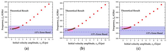 Frequencies calculated by the molecular dynamics (MD) simulation at different initial velocity amplitudes. (a) mode11, (b) mode21, (c) mode22.