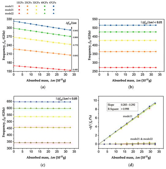 It is well known that enhancing the stress in graphene sheets contributes to an increase of rensonant frequencies and frequency shifts. Hence, the square graphene sheet was stretched axially to generate a series of tensile stress at a range of 12–47 GPa. To achieve higher sensitivity, absorbed gold atoms were constrained to a circular area with a radius of 10 Å in the middle of the graphene sheet. Then, the resulting different frequency responses to the absorbed mass were observed, as depicted in Figure 5. Under tensile stresses of 12, 23, 32, 40 and 47 GPa, the fundamental natural frequency of the graphene sheet was calculated as 169.5, 227.3, 268.0, 298.8 and 323.2 GPa, respectively, as shown in Figure 5a. The fundamental frequency is proportional to the square root of the tensile stress, as indicated in Equation (3). Moreover, Figure 5a presents the frequency shift of mode11 when 1–10 gold atoms with masses of 3.3–33 × 10−22 g were placed in the middle of the monolayer of the graphene sheet. The fundamental frequency shift was −0.480, −0.643, −0.772, −0.864 and −0.943 GHz/(10−22 g), respectively, thus showing a linear relashionship with the square root of the tensile stress. By contrast, Figure 5b,c show the insensitivities of mode21 and mode22 to central mass. The frequency shifts of mode21 and mode22 were less than 0.01 and 0.05 GHz/(10−22 g), respectively, and much lower than that of mode11. It can also be seen from Figure 5b,c that the frequencies of mode21 and mode22 increased simultaneously with the increasing stress in the graphene, obeying Equation (3), as the fundamental frequency did. In Figure 5d, the frequency-shift ratio Δfnm/fnm under different tensions exhibited almost an identical relationship with the absorbed mass. The average frequency shift ratio of mode11 induced by the central absorbed mass of 10−22 g is 0.287%, similar to the theoretical result of 0.266% and in accordance with Equation (5) where S11(0, 0), is assumed to be 4. On the contrary, the frequencies of mode21 and mode22 showed negligible variations in response to the absorbed mass. In this way, the insensitivity to the central absorbed mass can be made use of to compensate for the influence of stress fluctuation.