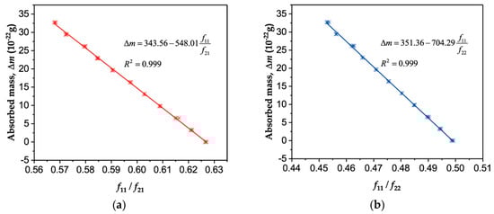 Herein, the absorbed mass can be determined using the frequency ratio of mode11 to mode21 or mode22, which are measured simultaneously, while suppressing the disturbance induced by the variance of tension. To achieve higher sensitivity, absorbed gold atoms were constrained to the middle of the graphene sheet, as demonstrated in Section 3.2. In this way, the parameter S11(0, 0) was up to 4, while S21(0, 0) and S22(0, 0) were equal to 0. From Equations (3) and (5), the absorbed mass can be calculated as