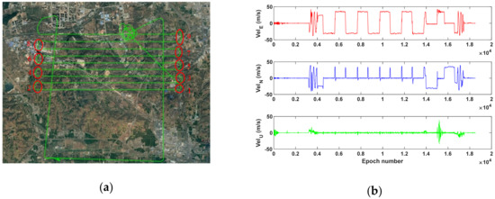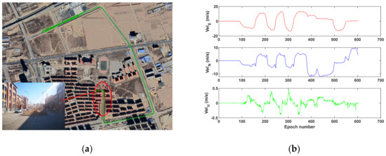 The average number of observed BDS-2 satellites is 7.6 (~3.7 GEO, ~3.9 IGSO, 0 MEO), and the average position dilution of precision (PDOP) is 4.2 during 10 min. It should be mentioned that all tests in this study only utilize 14 BDS-2 satellites, rather than MEO satellites contained in BDS-3 [25]. Figure 2 shows the vehicle’s trajectory (a) and the reference velocity (b). It can be seen from Figure 2b that the velocity in the east, north and up directions are within 20, 10 and 0.5 m/s, respectively.
