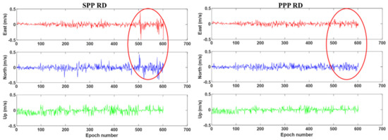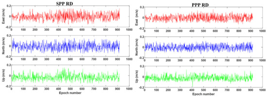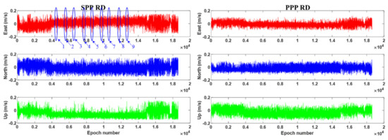 Figure 3 displays the velocity error computed by BDS-2 SPP RD (left) and BDS-2 PPP RD (right) results. It can be seen from Figure 3 that the accuracy of the BDS PPP RD method in the vehicle-borne experiment is significantly better than that of the SPP RD method. It is noted that during the 500th–600th epoch, when satellite signals are partially blocked by surrounding buildings and trees, the velocity error of BDS-2 SPP RD fluctuates largely with a maximum error of 0.5 m/s. In contrast, the BDS-2 PPP RD velocity is obviously less affected by the observation environment compared to the SPP RD solution, which proves that the method proposed in this paper is more suitable in complex kinematic scenes. The RMS statistics of the SPP RD and PPP RD velocities are summarized in Table 3. It can be seen from Table 3 that the precision of both the PPP RD method and the SPP RD methods can reach the level of cm/s. The velocity accuracies of the the PPP RD method are 28.4%, 27.1%, 26.1% better than the SPP RD method in the E, N, U directions, respectively.