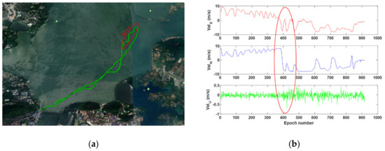 The trajectory (a) of the ship-borne experiment and its reference velocity (b) are shown in Figure 4. The average number of observed satellites is 9 (GEO = 5, IGSO = 3, MEO = 1), and the average PDOP is 2.2 during 16 min. Since the ship used in this experiment is a motorboat, the magnitude and direction of its velocity can change must faster than that in the vehicle-borne test. The motorboat takes a U-turn and several consecutive sharp turns between the 370th and 400th epochs, which are marked in red in Figure 4.
