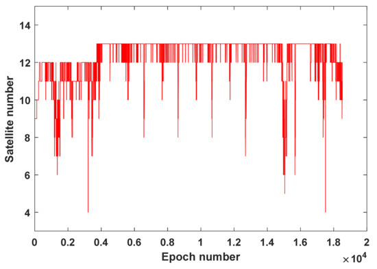 Figure 7 shows the error series obtained by the BDS-2 SPP and PPP RD methods, separately. It can be concluded from Figure 7 that the PPP RD method is obviously better than the SPP RD method, especially during the taking-off and landing stages. Moreover, during the nine turns in the cruising stage, on the one hand, the number of observed satellites suddenly decreases due to the sudden motion change of the airplane (Figure 8); on the other hand, owing to the sudden change in the velocity magnitude and direction, the SPP RD method has a large error in the velocity solution, especially in the east–west direction as highlighted in Figure 6. The RMS statistics of SPP RD and PPP RD are shown in Table 5. It is clear from Table 5 that the precision of the PPP RD method is better than that of the SPP RD method, and the improvement rates are 38.1%, 17.6%, 17.5% in the E, N, U directions, respectively.