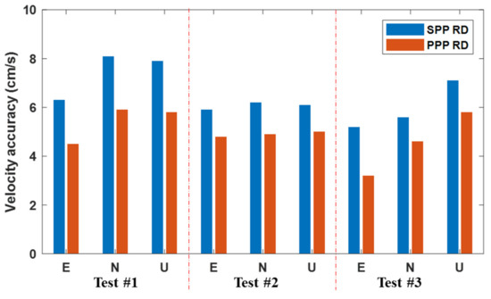 From the above three experiments, it can be concluded from Figure 9 that the BDS-2 PPP RD method has better velocity estimation precision than the SPP RD method in various kinematic scenarios by 1–2 cm/s in the three directions. The vehicle-borne experimental result shows that when the observation environment becomes worse, the PPP RD method can significantly improve the velocity estimation performance. Through ship-borne and air-borne experiments, it can be seen that, when the magnitude and direction of the moving object’s velocity suffer from active changes, the PPP RD method can also provide more precise velocity than the SPP RD method.