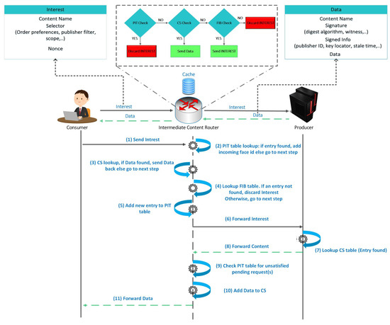 Figure 1 illustrates the stepwise communication process of an NDN architecture. To retrieve the content, a consumer sends an interest packet with the content name and its selectors (attributes, filters, resolutions, nonce etc.) When an interest packet is received by some intermediate content router, then the content router first checks the PIT. If an entry is found in PIT but with a different receiving face or with a different interest payload ID or with a different nonce, then the PIT table is updated by adding incoming interface entry and the packet is dropped. If an entry is not found in PIT, then the CS is checked using the content name and selectors. If the content is found, then the content is sent back to the interested consumer via an interface from which the request for content was received. If the content is not found in the CS, then a new PIT entry is created, and the interest packet is sent upstream via interface(s) stored in the FIB. The interest message is discarded if no FIB entry is found [7].