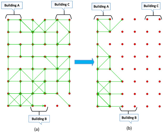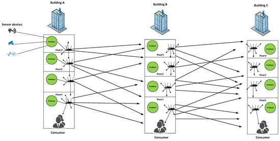 Figure 6a,b shows the location of building A, building B and building C on a 40 × 40 grid topology that is made up of 48 static Nodes. Each building comprises of 16 static nodes including one provider node and one consumer node. We also deploy four mobile nodes in the building to exhibit the mobile behavior of nodes and for carrying the data packets to consumers.