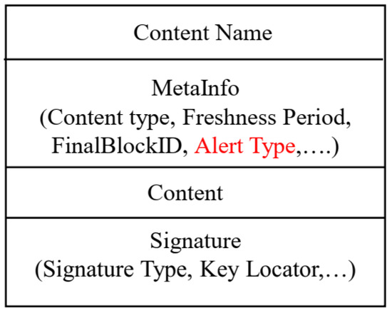 We performed a minor modification of the NDN packet format in the optional information field (MetaInfo) with “AlertType ” for marking the types of alert. Since there could be several types of alert in a smart campus scenario such as smoke alert, heat alert, fire alert (gives early warning of developing fires to enable evacuation), and intruder alert (detects attempted intrusion or unauthorized entry into a building or room and such alarms may be linked to surveillance cameras, light systems, and remote monitoring by security companies). For instance, when temperature increases than a certain threshold in a room, then the concerned person or administrator of that building or floor must be alerted. Data packets generated by that room gets named by the name of the room where the hazard occurs. The enhanced data packet format is shown in Figure 3. The changes of class for unsolicited data that abstract NDN data packets are detailed in Section 6.