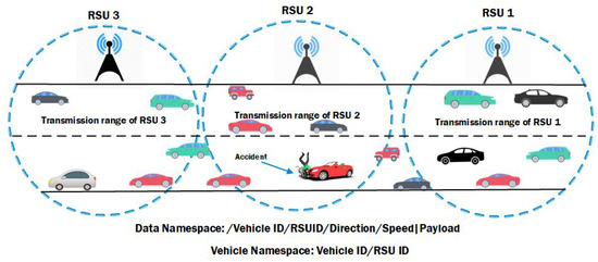 Let’s suppose that an accident occurs near RSU2. That means the accidental vehicle is in the range of RSU2. In that case, the affected vehicle (producer) will not wait for a consumer request and it will broadcast the data immediately in the transmission range instead. Due to ad hoc scenario, the data will be broadcasted in the transmission range and all vehicles will broadcast the data packets further. Figure 5 illustrates that a producer node (accidental vehicle) which is in the transmission range of RSU2 broadcasts an emergency alert. This emergency alert has been received by all vehicles in the transmission range. Since these vehicles are moving therefore, they will move into other RSUs range and will further broadcast the data in their transmission range. In this way, all the vehicles start transmission of data packets which will be flooded in the network. Although the data packet is destined for RSU2, it is flooded to all RSUs. Such flooding creates congestion and overhead in the network which directly affects the resources of the network. As a result, the emergency data might not reach on proper time to the appropriate consumer to take timely action. This data flooding is a serious issue in VNDNs where forwarding of critical data is first priority. Most of the papers in the VNDNs literature mitigated this issue via interest suppression schemes and other metrics such as hop counts etc. So far, there are no such mechanisms available in the literature for VNDNs that address this issue via NDN namespace design.