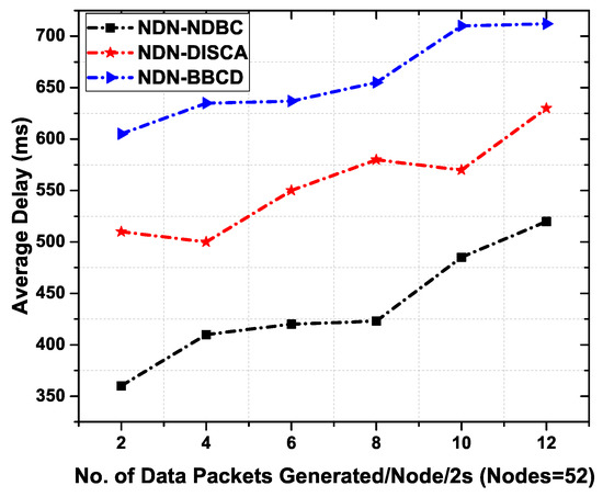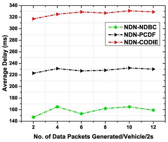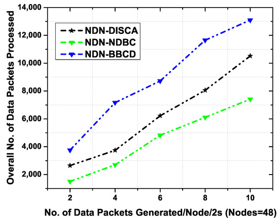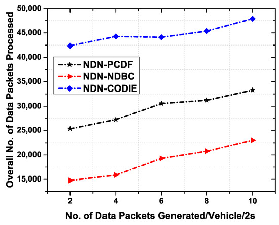 In this phase, we evaluate and conduct experiment to check the performance of the proposed scheme NDN-NDBC as well as the benchmark scheme NDN-CODIE and NDN-PCDF against the number of data packets generated per vehicle per 2 s. Total number of nodes are 50 and the average speed is 60 Kmph. It is evident from Figure 12 that NDN-NDBC remarkably decreases the number of data packets in the network comparatively than NDN-CODIE and NDN-PCDF. This is achieved due to name-based data control. In the NDN-PCDF case, all the vehicles no matter which RSU they belong to, first broadcast a beacon message and then forwards the data packets which result in broadcast storm in the network. Moreover, in NDN-CODIE, first an interest message is generated for content and then the data packet comes back up to h number of hops recorded in the DDL field. This mechanism includes extra data structure which eventually increases the overhead in the network. Hence the overall number of data packets processed in NDN-CODIE are higher than the other two schemes. However, in NDN-NDBC, the vehicles in the range of RSU when receive the data packet, first compare their namespace with the received data packet namespaces. If the data packet is destined for that vehicle, then it processes the data packet, otherwise, all the data packets are discarded and are not processed/forwarded further.