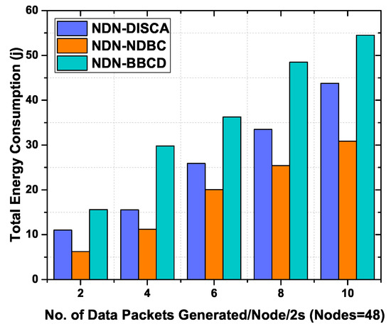 In this experiment, we investigate the performance of the proposed NDN-NDBC protocol, NDN-BBCD and NDN-DISCA by varying the number of data packets per 2 s in the network and have used 48 static nodes. Due to high data packets transmissions in the network, the overall energy consumption of nodes and bandwidth use is affected, overall. The reason is that the size of data packets is larger than the interest packets and remarkably impact the network resources. In NDN-DISCA, all the intermediate nodes first generate an alert message and then broadcast it in the network. As the beacon messages carry control information, therefore, broadcasting of beacon messages may increase the chances of network congestion and more resources may be used. Moreover, in NDN-BBCD more packets are transmitted than NDN-DISCA due to interest and data exchange for content discovery and content delivery. As a result, a higher amount of energy is consumed in the network. Whereas the proposed scheme NDN-NDBC does not rely on beacon message nor interest messages and forwards a smaller number of data messages, overall. The reason behind this phenomenon is many nodes simply discard the data messages that have not a match for data packet namespace with their node id.