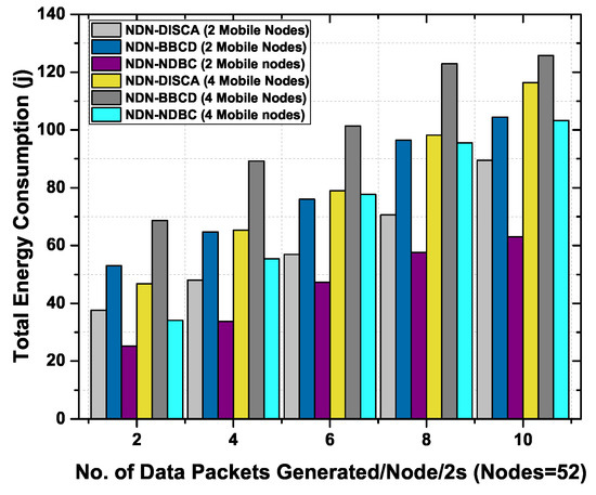 We also analyze the energy consumption of the proposed NDN-NDBC scheme with NDN-BBCD and NDN-DISCA by varying the number of mobile nodes in the network from 2 to 4. Figure 10 shows the total energy consumption of all nodes in the network as a function of number of data packets generated per 2 second with 2 and 4 mobiles nodes. The mobile nodes exhibit more data packets while moving in the network. It is evident that NDN-DISCA and NDN-BBCD shows high power consumption in both case of mobile nodes (2 and 4). The reason is the number of control information are used for data delivery in NDN-BBCD and beacon messages in NDN-DISCA. Whereas NDN-NDBC shows less energy consumption than NDN-DISCA and NDN-BBCD in both case of mobile nodes (2 and 4). The is due to the reason the data packets are controlled to a specific building where the consumer resides. The proposed scheme NDN-NDBC controls the broadcast storm in the network including mobile nodes and discards the data packets which do not belong to a data namespace. As we have discussed before the data packet directly impacts the energy consumption of the nodes. Therefore, the total energy consumption of NDN-NDBC protocol is less than NDN-DISCA and NDN-BBCD due to controlled data packets.