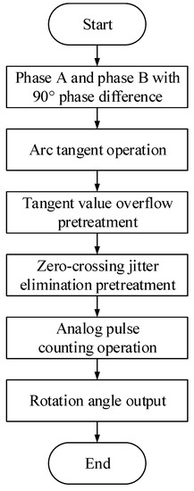 The APC method to generate the encoder output is through calculating the arctangent value of the signal, and then processing the analog signal. First, the phase angle signal arc tangent is computed; then the arc tangent value is used to simulate the pulse count. Finally, all of the pulse’s corresponding angles are superimposed to generate the output encoder rotation angle. The flowchart of the algorithm is shown in Figure 3; each of the steps is described below.