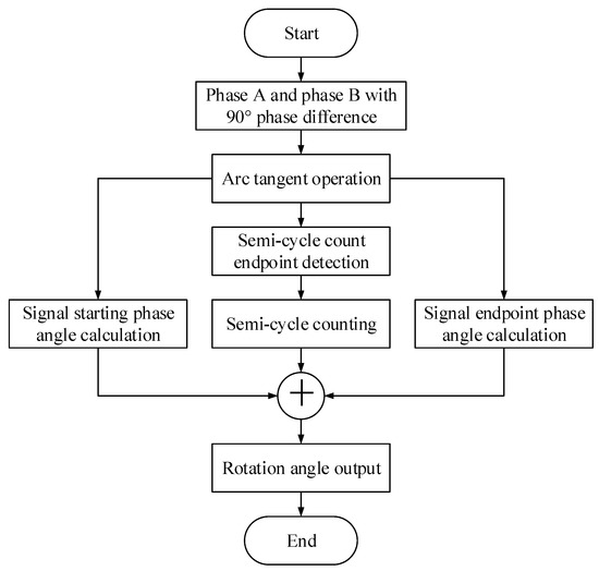 The ATS method generates the encoder output rotational angle by calculating the arctangent of the signal. First, the arctangent of the phase angle is calculated. Then, the starting phase angle, the total number of the half-period, and the signal endpoint phase angle of the signal are calculated. Finally, the encoder rotational angle is output. The algorithm flowchart is shown in Figure 4; each of the steps is described below.