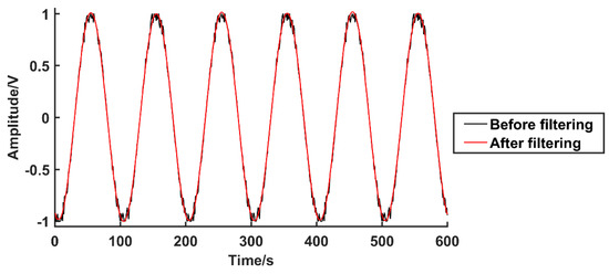 The sin-cos signal of phases A and B (Figure 5) is substituted into the zero phase bandpass filtering algorithm. The algorithm iterates, resulting in a denoised digital signal, with a two phase angle with a 90° difference. The phase A is taken as an example, as shown in Figure 6.