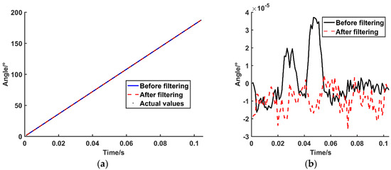Result comparison before and after filtering. (a) The encoder rotation angles obtained by ATS method before and after filtering. (b) Angular deviation between calculated results and actual values before and after filtering.