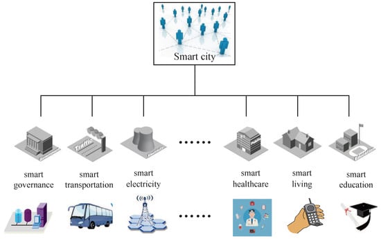 Recently, with the rapid development of the Internet of Things (IoT) [2] and ICT, the applications of the smart city [3] are on the rise, which can enhance the life quality of citizens. Representative smart city applications are given in Figure 1, which benefit the city and people in a variety of aspects: economy, education, healthcare, and living. Meanwhile, the smart city has a new, complete level of effectiveness, sustainability and efficiency.