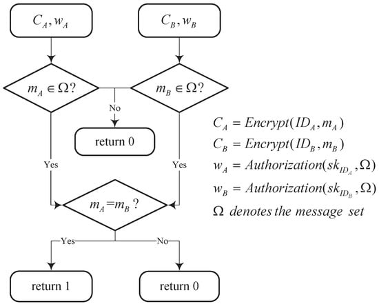 For making the equality test more flexible, based on bilinear pairing and secret sharing, Huang et al. [38,39] proposed the public key encryption with the filtered equality test (PKE-FET). In these schemes, the receiver selects n messages as a set , and then the receiver can use a private key and to generate the warrant w and sends this warrant to someone, who can execute the equality test without decryption.