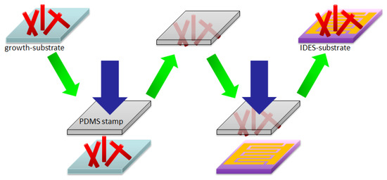 In this work two different gas sensing platform chips were used: Si-based and microhotplate-based devices. Si-based (SB) sensors were prepared by photolithography, evaporation of Ti/Au-IDES structures (thickness 5 and 150 nm, respectively) on Si substrates (coated by 300 nm SiO) and subsequent lift-off process. Electrodes width and the distance between electrode fingers were 10 m. The second type of gas sensing platform chip was a 2 × 2 mm membrane-based microhotplate device containing Pt-IDES with an electrode width and the distance between the electrode fingers both 5 m. This is a commercial sensor platform provided by ams AG, Austria, which contains an Pt-based electric microheater on a silicon nitride membrane (1 m thick), to achieve good thermal isolation and decrease the power consumption of the device. The integration of SnO NWs on both types of gas sensing devices was performed by a transfer printing process (see Figure 2). A 5 × 5 mm stamp of polydimethylsiloxane (PDMS) was fabricated by a standard Dow Corning Sylgard 184 10:1 recipe. The transfer process was performed by first pressing the PDMS stamp to the SnO NWs coated Si substrate—to harvest the NWs. Second step was to press the PDMS stamp with the NWs to the gas sensing devices—to deposit the NWs directly onto the region of inter-digital electrode structures (IDES), which are used for electrically contacting the NWs. So obtained samples could be measured electrically by reason of the NWs, which interconnected the fingers of the IDE structure. Harvesting the NWs in a “dry” method allowed to avoid any organic contamination, which is often visible in “wet” processes. Coffee-ring effect is also avoided, which allowed homogeneous dispersion of NWs on the transferred substrate.