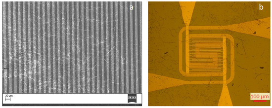 (a) SnO NWs transferred on SB sensor, (b) SnO NWs transferred on microhotplate-based sensor.