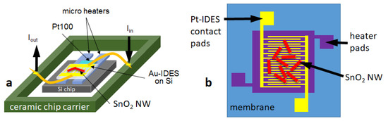 A SEM picture of the SnO NWs transferred on the Si substrates is shown in Figure 3a. The NWs-structure was “spaghetti-like”, dense and homogeneously distributed over the IDES structure. Figure 3b shows the microhotplate-based sensor device showing SnO NWs on top of the IDES structures. To achieve the required operation temperature, the Si-based substrate was then glued on microheaters (10 × 2 Pt 6.8 Delta-R GmbH, Mannheim Germany) and a Si chip as heatspreader with ceramabond (Aremco Products, Inc., distributor in Hannover Germany). An additional resistance temperature detector (4 × 1 Pt100, Delta-R GmbH, Mannheim Germany) was employed for temperature control. The whole structure was then connected to a ceramic chip carrier to enable the performance measurements, ensure thermal stability and electrical contacts to gas measurement chamber (see Figure 4a). The microhotplate-based device exhibits an integrated Pt-based electric microheater on a membrane (see Figure 4b). After print transfer of the NWs the chip required only bonding on a PCB-holder for further gas performance evaluation.