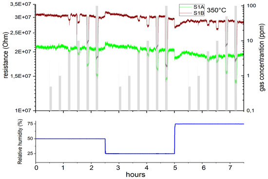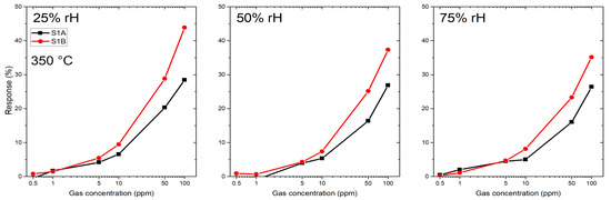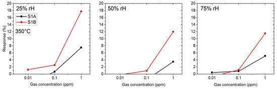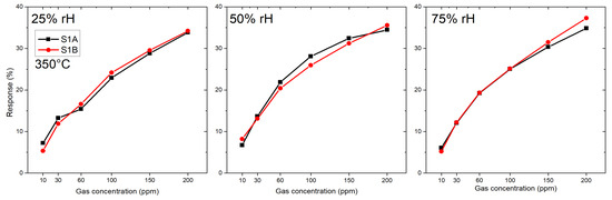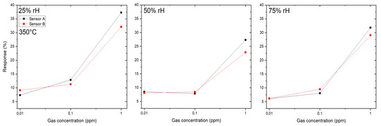 Two microhotplate-based sensors (sensor 1A and 1B) were produced by the same methodology as described in Section 2.2, and were characterized towards the target gases CO, HS and a specific HCMix. The resulting response towards carbon monoxide is shown in Figure 7. Six gas concentrations were measured: 10, 30, 60, 100, 150 and 200 ppm in the presence of three different humidity levels—25, 50 and 75%. The operating temperature of the micro hotplate was kept constant at 350 C. Both sensors showed a similar sensing performance, but the sensor 1B has a slightly higher response towards CO. From Figure 7 it is clearly visible that the response towards CO is independent from humidity—i.e., for 200 ppm of CO for sensor 1A the response values are 34%, 35% and 35% for 25, 50 and 75% RH levels, respectively. The difference between responses at different humidity levels in this case is only 3%, which is highly promising for real-life application.